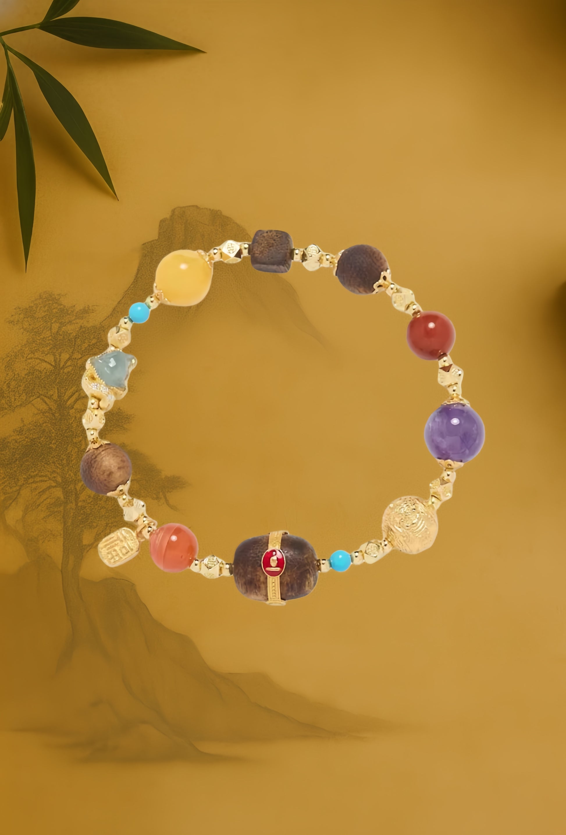 Ground your spirit in the soothing wood scent while the vibrant harmony of Amber, Blue Water Jadeite, and Nanhong Agate aligns your inner energy with radiant light and prosperity.