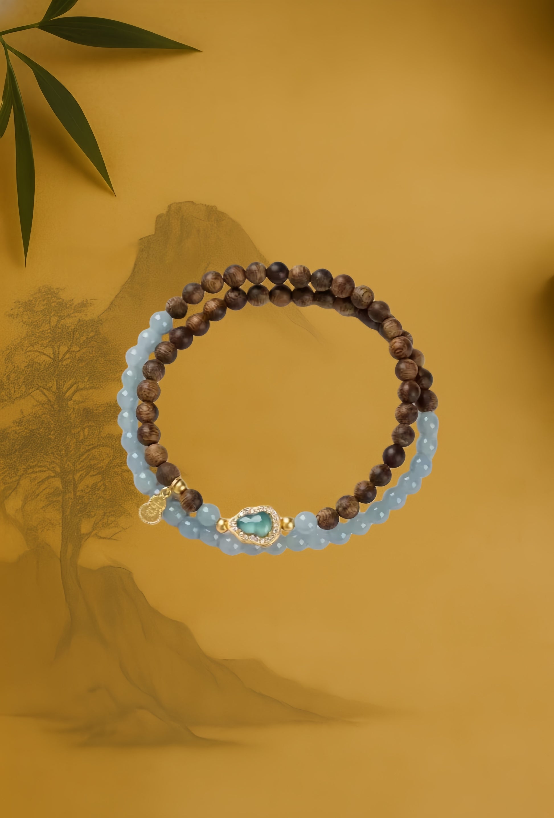 A signature design featuring a balanced pairing of natural Agarwood beads and translucent Blue Water Jadeite, centered with a refined Silver-plated gold teardrop charm.