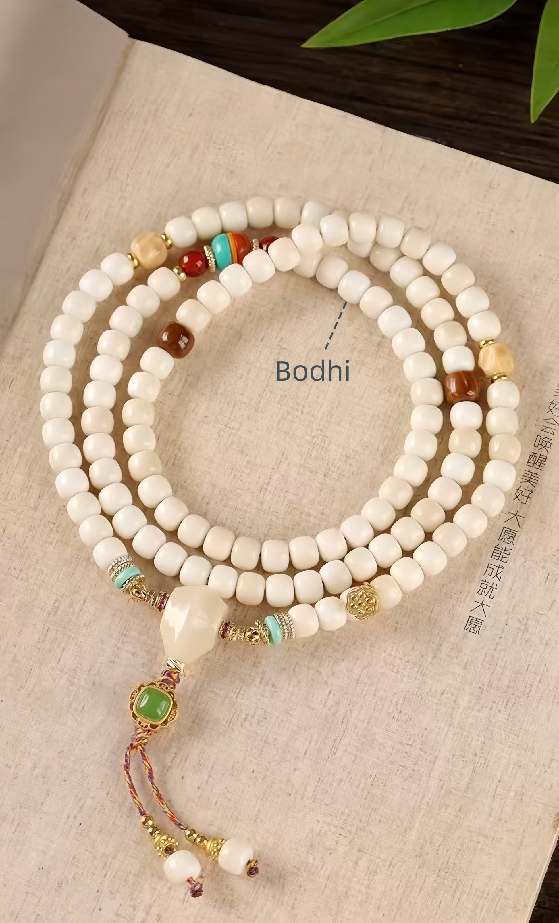 A classic 108-bead mala crafted from polished White Jade Bodhi Root, accented with vibrant Turquoise and warm Red Agate focal beads.